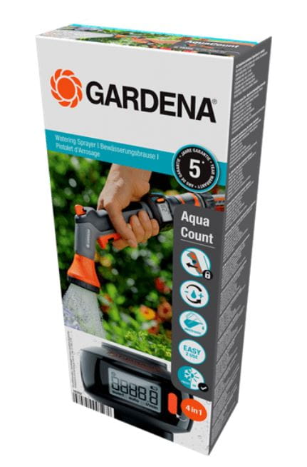 Wbudowany licznik wody wspiera Cię w zrównoważonym nawadnianiu, umożliwiając oszczędzanie wody. Twoje rośliny będą Ci wdzięczne za delikatny prysznic, którego intensywność możesz regulować w tylnej części pistoletu. Działanie pistoletu jest proste, a ergonomiczny uchwyt sprawia, że znakomicie leży on w dłoni. Praktyczna funkcja blokady pozwala dłoni wypoczywać w trakcie podlewania, co ma szczególne znaczenie przy długotrwałym nawadnianiu. Licznik wody można obracać, dzięki czemu równie wygodnie korzystają z niego osoby prawo- i leworęczne, a cztery funkcje dostarczają użytkownikom interesujących ich informacji. Funkcje 1 oraz 2 pokazują informacje na temat ogólnego dziennego lub sezonowego zużycia wody. Funkcja 3 informuje o dokładnym zużyciu wody w danym cyklu nawadniania, natomiast funkcja 4 pokazuje wartość przepływu wody w litrach lub galonach na minutę. Pistolet zraszający AquaCount jest odporny na działanie promieni UV oraz na mróz, dlatego można go pozostawiać na dworze przez cały rok.