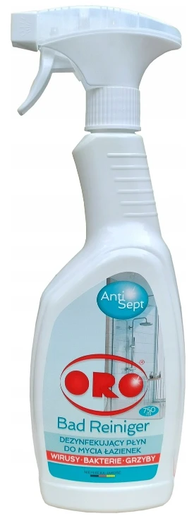 Płyn do mycia łazienek marki ORO o pojemności 750 ml przeznaczony do dezynfekcji i czyszczenia powierzchni niemających kontaktu z żywnością. Wykazuje działanie bakteriobójcze, grzybobójcze oraz bójcze wobec wirusów osłonkowych.