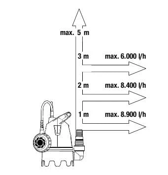 Pompa może pracować przy maksymalnym zanurzeniu 6 metrów . Może wypompować wodę na wysokość do 5 m powyżej jej poziomu. Ta praktyczna, wielofunkcyjna pompa zanurzeniowa nadaje się nie tylko do użytku w ogrodzie, ale poradzi sobie też z zalanymi pomieszczeniami, dlatego nie musisz się już przejmować podtopioną piwnicą.