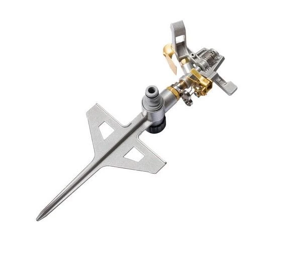 - profesjonalny metalowy zraszacz pulsacyjny na podstawie szpilki z dodatkowymi ramionami, które zapewniają maksymalną stabilność