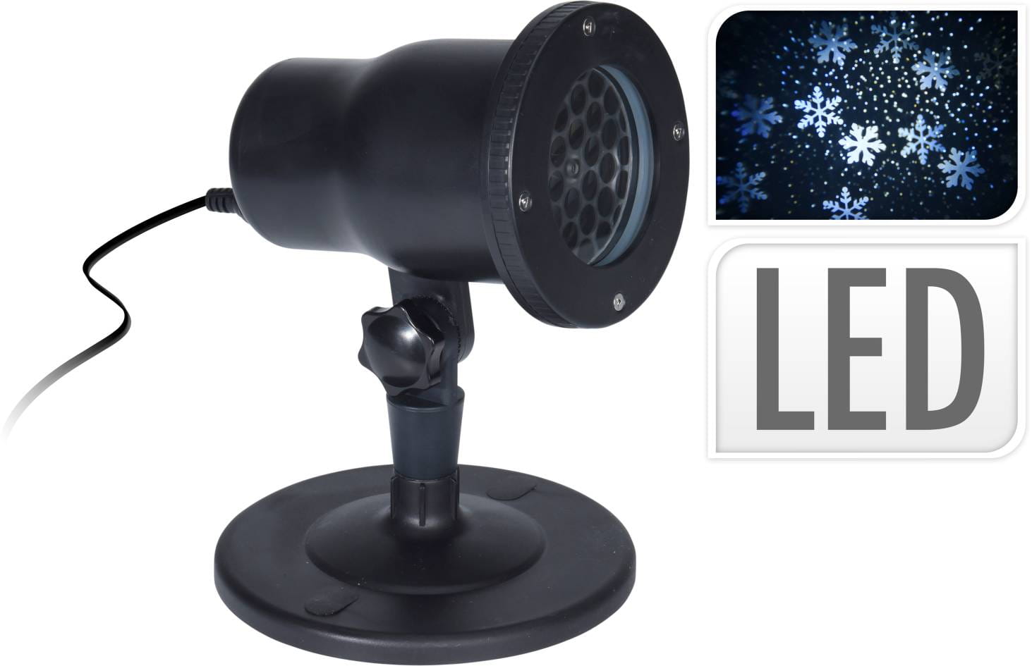 Projektor LED emituje 1 wzór w postaci płatków śniegu w białym kolorze. Może on oświetlić powierzchnię do 20 m2 (ok. 4x4 m) i działa on na dystansie od 2 do 9 m od oświetlanej powierzchni.