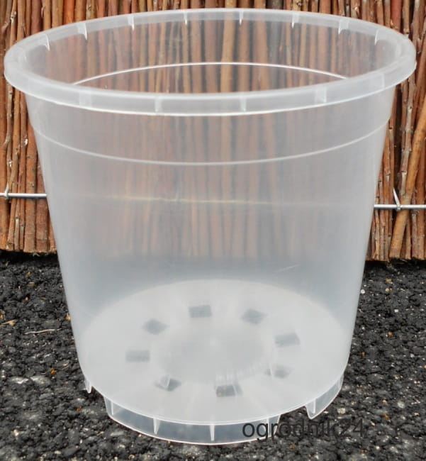 Doniczka wykonana z mocnego tworzywa sztucznego, transparentna.