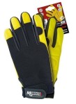Rękawice ochronne wykonane z wysokiej jakości skóry bydlęcej połączonej z czarną tkaniną.