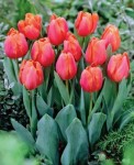Odmiana tulipana z grupy Triumph, charakteryzująca się różowo-pomarańczowymi kwiatami z żółtym środkiem i czarnymi pręcikami