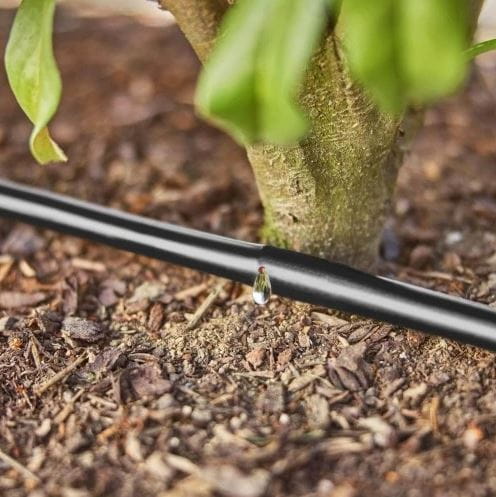 - Elastyczna instalacja: Dzięki zintegrowanym rekompensującym ciśnienie kroplownikom i zawartej blokadzie do korzeni możliwe jest ułożenie rury kroplującej także niewidocznie, pod ziemią