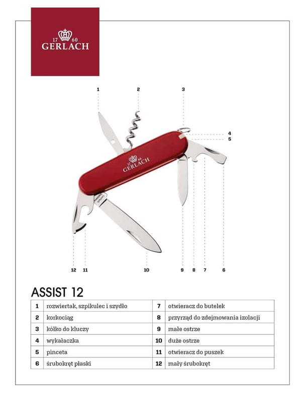 Scyzoryk Gerlach Assist 12 posiada 12 funkcji, które z pewnością przydadzą się w podrózy, w domu, podczas uprawiania sportów outdoorowych czy survivalu.