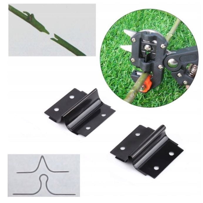 W zestawie oprócz taśmy i sekatora znajdują się także trzy wymienne stalowe wkładki do szczepienia o różnych kształtach (jedna jest już zamontowana), a także zapasowa podkładka.