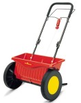 Uchwyt blokujący rozrzucanie gwarantuje, że żadne z nasion nie wypadnie z zasobnika, a specjalne koła zapewniają spokojne prowadzenie oraz wygodę przy napełnianiu.