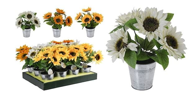 Dekoracyjna roślina słonecznik w ocynkowanej osłonce.