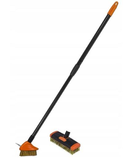 Zestaw zawiera dwie szczotki, jedna do usuwania mchu, trawy z fug kostki brukowej oraz druga do ogólnej pielęgnacji i czyszczenia powierzchni brukowych.