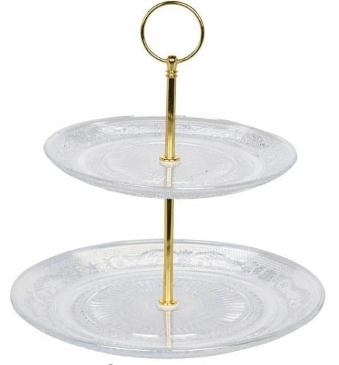 Patera jest dwupoziomowa. Pięknie prezentuje się na stole jako patera na słodycze, orzeszki, ciasteczka.