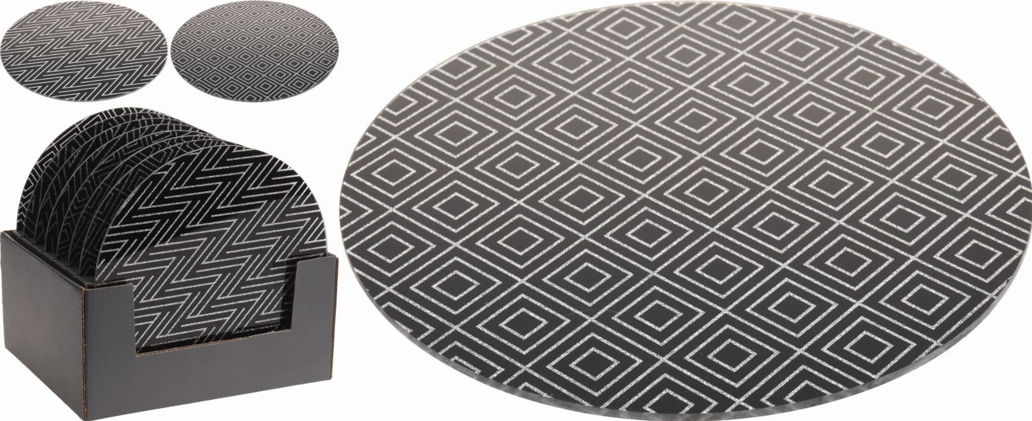 Podstawka pod świecę w kolorze czarnym ze wzorkiem wykonana ze szkła i zdobiona brokatem.