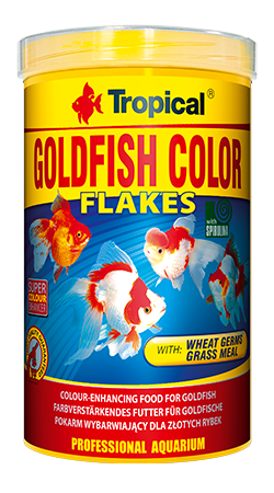 GOLDFISH COLOR pokarm wybarwiający dla złotych rybek. GOLDFISH COLOR to pokarm wybarwiający w formie płatków dla wszystkich odmian złotych rybek oraz młodych karpi koi, żyjących zarówno w akwariach, jak i oczkach wodnych. Bogata receptura pokarmu GOLDFISH COLOR uwzględnia różnorodną dietę ryb karpiowatych, zapewniając im doskonałą kondycję. Duży udział błonnika, między innymi z mieszanki traw, dba o prawidłową pracę długiego przewodu pokarmowego tej grupy ryb, a L-karnityna reguluje metabolizm tłuszczów, ułatwiając jego pełne wykorzystanie przez organizm ryb. Obecne w pokarmie zarodki pszenne są źródłem cennych, nienasyconych kwasów tłuszczowych oraz skoncentrowanej dawki witamin i mikroelementów. Regularne stosowanie płatków GOLDFISH COLOR wpływa na zwiększenie intensywności barw ryb, dzięki dodatkowi astaksantyny.