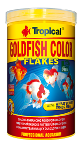 GOLDFISH COLOR pokarm wybarwiający dla złotych rybek. GOLDFISH COLOR to pokarm wybarwiający w formie płatków dla wszystkich odmian złotych rybek oraz młodych karpi koi, żyjących zarówno w akwariach, jak i oczkach wodnych. Bogata receptura pokarmu GOLDFISH COLOR uwzględnia różnorodną dietę ryb karpiowatych, zapewniając im doskonałą kondycję. Duży udział błonnika, między innymi z mieszanki traw, dba o prawidłową pracę długiego przewodu pokarmowego tej grupy ryb, a L-karnityna reguluje metabolizm tłuszczów, ułatwiając jego pełne wykorzystanie przez organizm ryb. Obecne w pokarmie zarodki pszenne są źródłem cennych, nienasyconych kwasów tłuszczowych oraz skoncentrowanej dawki witamin i mikroelementów. Regularne stosowanie płatków GOLDFISH COLOR wpływa na zwiększenie intensywności barw ryb, dzięki dodatkowi astaksantyny.