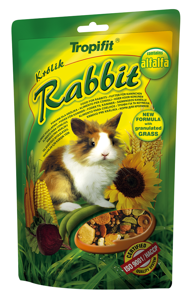 Pełnowartościowy pokarm dla królików, z dodatkiem chleba świętojańskiego i bogatej w białko, granulowanej lucerny. Podstawowym składnikiem pokarmu RABBIT są granulaty ze zbóż i lucerny, uzyskane metodą ekstruzji, która zwiększa strawność i przyswajalność zawartych w zbożach i lucernie składników odżywczych. Ponadto ekstruzja eliminuje bakterie i grzyby obecne w naturalnych surowcach. Zawarte w pokarmie fruktooligosacharydy korzystnie wpływają na przebieg trawienia i florę bakteryjną jelit. Wielkość i kształty granulatów pozwalają zwierzętom ścierać zęby i utrzymać higienę jamy gębowej. Bogactwo zawartych w pokarmie RABBIT składników odżywczych oraz pochodzących z naturalnych źródeł witamin, mikro- i makroelementów zapewnia króliczkom doskonałą kondycję oraz błyszczące i miłe w dotyku futerko.