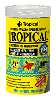 TROPICAL GRANULAT wysokobiałkowy pokarm w formie granulatu. TROPICAL GRANULAT przeznaczony jest do codziennego karmienia ryb wszystkożernych i mięsożernych. Regularnie stosowany zapewnia efektywny przyrost masy ciała i dostarcza niezbędnych witamin oraz mikro- i makroelementów. Szczególnie zalecany jest do karmienia tarlaków i młodych ryb większych gatunków, którym dostarcza cennego białka pochodzenia roślinnego i zwierzęcego, bogatego w niezwykle ważne aminokwasy egzogenne. Tonący granulat dociera również do strefy dennej, gdzie może być pobierany przez kiryski i inne niewielkie sumy. Wysoką wartość odżywczą granulatu TROPICAL można wykorzystać również w okresie rekonwalescencji, gdy ryby potrzebują szczególnej troski i wysokoenergetycznych, łatwostrawnych pokarmów, bogatych w witaminy i mikroelementy. Na uwagę zasługuje wysoki dodatek stabilizowanej witaminy C, która między innymi wzmacnia odporność ryb na choroby, przyspiesza gojenie się ran i otarć, a także odgrywa istotną rolę w rozwoju młodych ryb, zapobiegając deformacjom układu kostnego.