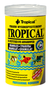 TROPICAL GRANULAT wysokobiałkowy pokarm w formie granulatu. TROPICAL GRANULAT przeznaczony jest do codziennego karmienia ryb wszystkożernych i mięsożernych. Regularnie stosowany zapewnia efektywny przyrost masy ciała i dostarcza niezbędnych witamin oraz mikro- i makroelementów. Szczególnie zalecany jest do karmienia tarlaków i młodych ryb większych gatunków, którym dostarcza cennego białka pochodzenia roślinnego i zwierzęcego, bogatego w niezwykle ważne aminokwasy egzogenne. Tonący granulat dociera również do strefy dennej, gdzie może być pobierany przez kiryski i inne niewielkie sumy. Wysoką wartość odżywczą granulatu TROPICAL można wykorzystać również w okresie rekonwalescencji, gdy ryby potrzebują szczególnej troski i wysokoenergetycznych, łatwostrawnych pokarmów, bogatych w witaminy i mikroelementy. Na uwagę zasługuje wysoki dodatek stabilizowanej witaminy C, która między innymi wzmacnia odporność ryb na choroby, przyspiesza gojenie się ran i otarć, a także odgrywa istotną rolę w rozwoju młodych ryb, zapobiegając deformacjom układu kostnego.