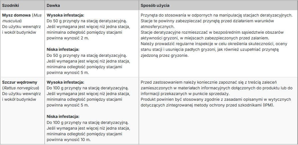 Wyłożyć preparat w stacjach deratyzacyjnych (karmnikach) lub płytkich naczyniach, w miejscach najczęściej odwiedzanych przez gryzonie (w pobliżu ich kryjówek i na drogach przebiegu, wzdłuż ścian, w miejscach spokojnych i suchych).