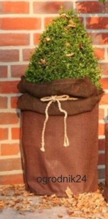 Materiał: donica zewnętrzna zachowująca kształt z trwałej juty (gęstość 230g/m kw.), laminowana od wewnątrz, górne zakończenie tkanina jutowa.