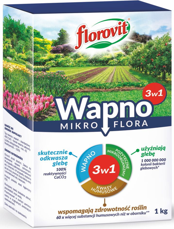 Florovit Mikroflora (3w1) to wielofunkcyjny nawóz, łączący działanie wapna granulowanego, kwasów humusowych oraz pożytecznych mikroorganizmów glebowych. To szybkodziałający nawóz, którego stosowanie gwarantuje lepszą zdrowotność uprawianych roślin oraz większe i dorodniejsze plony.