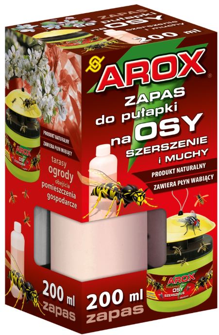 Zapas do pułapki Arox to preparat w 100% naturalny, przeznaczony do monitorowania aktywności os, szerszeni (Vespidae) oraz pospolitych gatunków much (mucha domowa, plujka pospolita, bolimuszka kleparka). Pułapkę można stosować na zewnątrz budynków, w ogrodach oraz w pomieszczeniach gospodarczych.