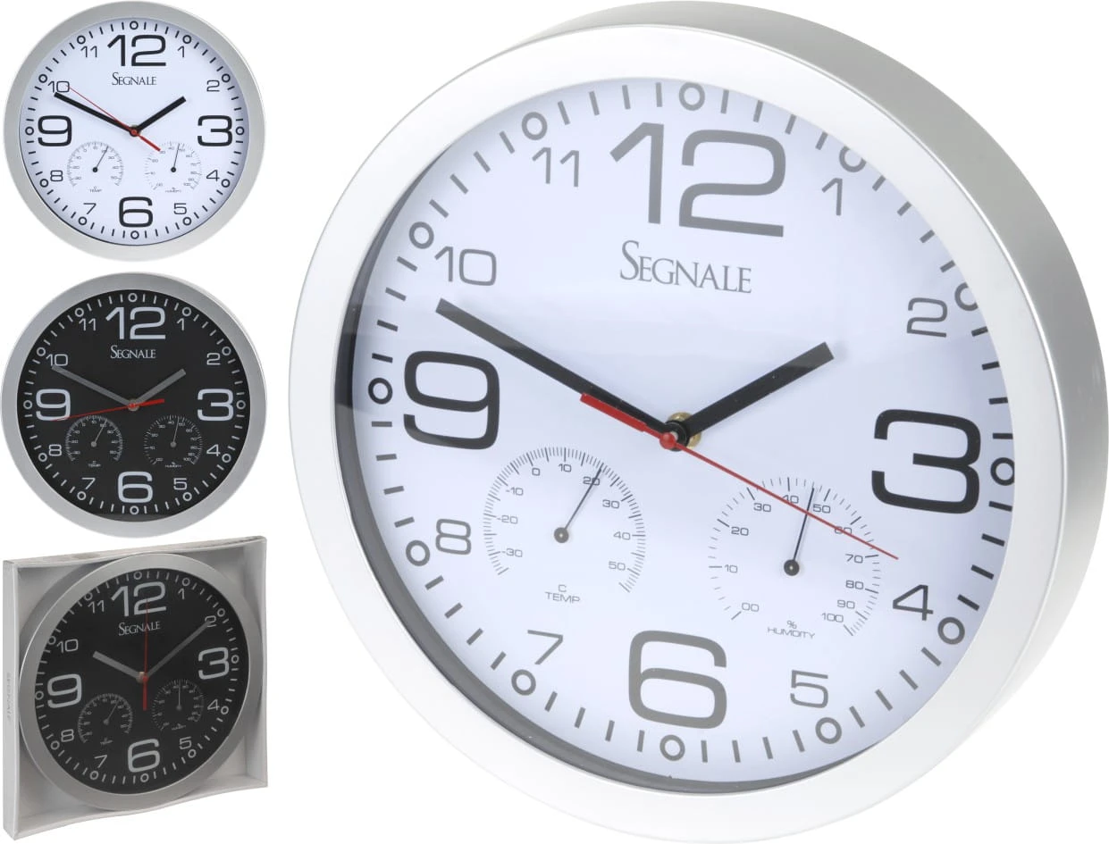 Okrągły analogowy zegar ścienny z termometrem, higrometrem i dużymi, arabskimi cyframi. Front wykonany ze szkła. Średnica 30cm.