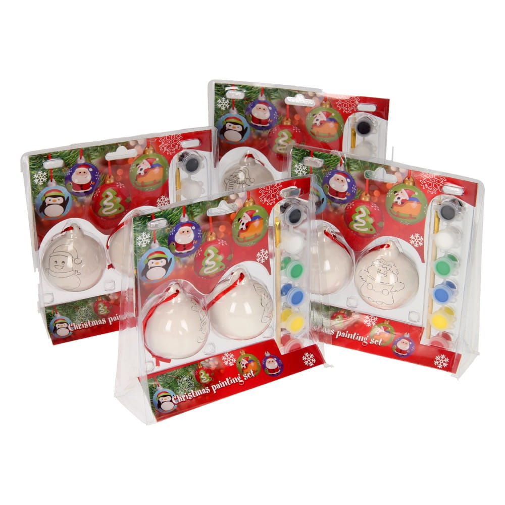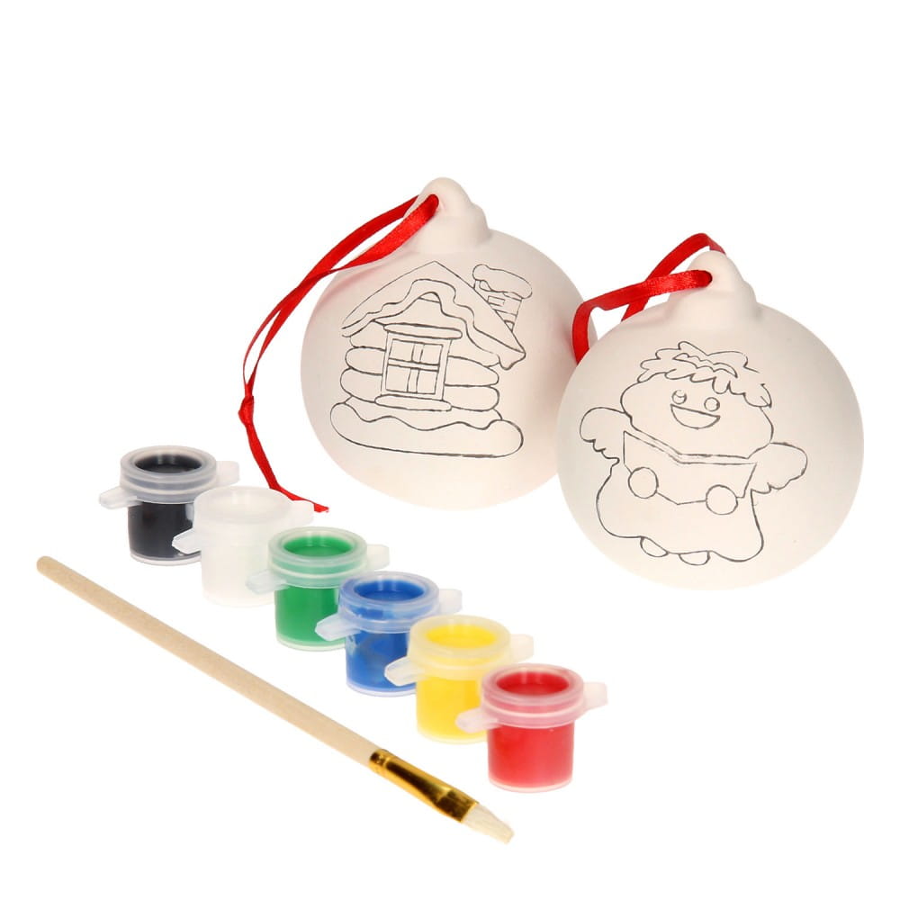W zestawie znajdują się: farby (6szt), pędzelek (1szt) i bombki (2szt).
