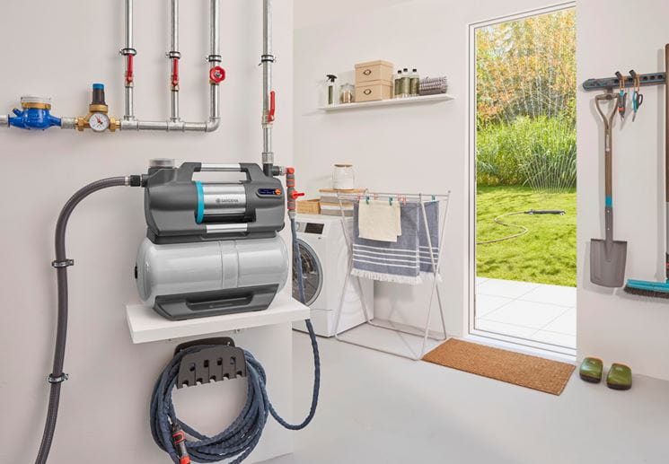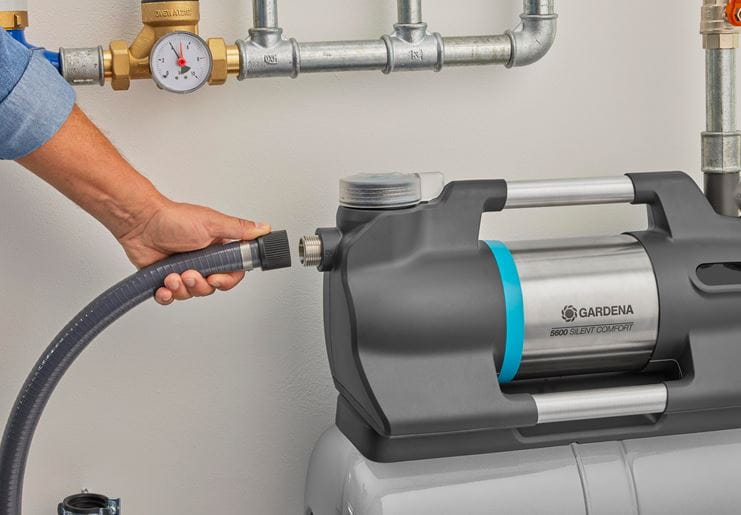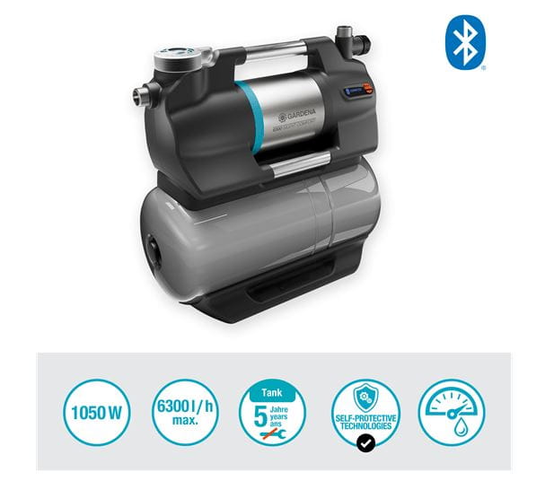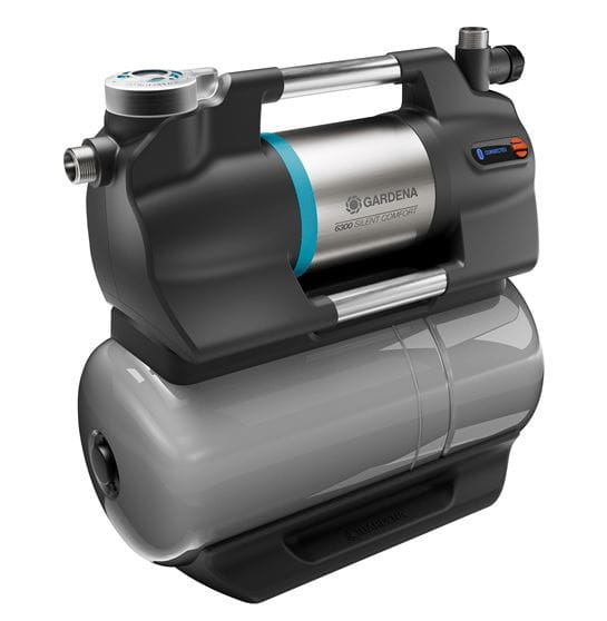 Przedstawiamy pompy o bardzo niskim poziomie hałasu i większej mocy, z kontrolą nawadniania za pomocą technologii Bluetooth. Jedną z nich jest GARDENA zestaw hydroforowy 6300 SilentComfort, stanowiący idealne rozwiązanie do automatycznego zasilania wodą domu i ogrodu. Pompa ciśnieniowa oferuje bardzo dużą moc z wysokością podnoszenia 49 m (4,9 bara) oraz przepływem 6300 l/h i może pobierać wodę z głębokości do 8 metrów. Umiarkowane zużycie mocy wynoszące zaledwie 1050 W przekłada się na dużą wydajność zestawu hydroforowego. Za pomocą pompy można automatycznie doprowadzać niedrogą wodę użytkową ze studni, beczki na deszczówkę czy cysterny do domu i ogrodu na potrzeby takich zastosowań, jak spłukiwanie toalety czy pranie. Zestaw włącza się automatycznie, gdy potrzebna jest woda, a następnie się wyłącza. Jako że może pobierać wodę ze swojego dużego zbiornika o pojemności 25 l, pracuje bardzo cicho i oszczędnie. Stworzony w Niemczech zestaw hydroforowy 6300 SilentComfort jest wyjątkowo cichy, oferując poziom ciśnienia akustycznego wynoszący zaledwie 44 db(A) w odległości 5 m. Jest to możliwe dzięki innowacyjnemu kilkustopniowemu działaniu i chłodzeniu wodą.