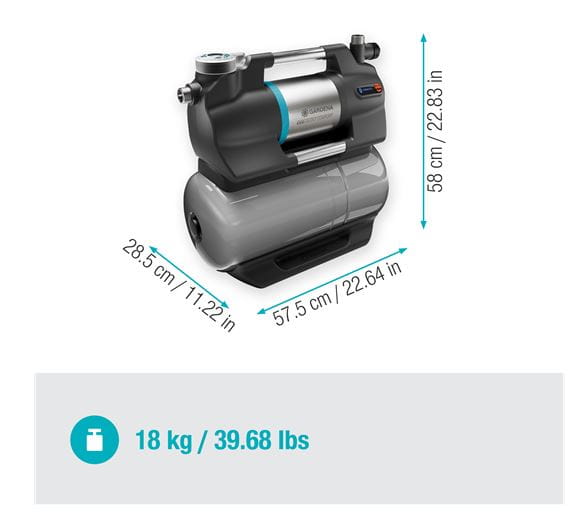 Technologia ta nie wymaga wentylatora, gdyż ciepło jest rozpraszane w wodzie. Dzięki temu produkt zapewnia najwyższą wydajność i najniższy poziom hałasu. Poza tworzeniem harmonogramu nawadniania, ważne funkcje można ustawić za pomocą podświetlanego ekranu LCD na urządzeniu, który umożliwia także jego włączanie i wyłączanie. Praktyczne połączenie Bluetooth pozwala w każdej chwili sterować pompą za pomocą smartfona lub tabletu z odległości do 10 m i uzyskiwać dostęp do funkcji dodatkowych. Będąc poza domem, można ustawić harmonogram nawadniania i minutnik, sprawdzić bieżące ciśnienie lub dostosować ciśnienie włączające i wyłączające pompę do swoich potrzeb. Możliwość połączenia z GARDENA czujnikiem wilgotności gleby sprawia, że rośliny są optymalnie zaopatrywane w wodę zgodnie z ustalonym wcześniej harmonogramem bez marnowania wody. W zbiorniku pompy o pojemności 25 l zamontowana jest niezwykle wydajna membrana. Dzięki temu zbiornik nie wymaga konserwacji przez co najmniej 5 lat, czyli nie trzeba uzupełniać powietrza ani wymieniać membrany. Wewnętrzna powłoka zbiornika wykonana jest z wodoodpornego, wielowarstwowego materiału, który chroni obudowę przed korozją. Zintegrowane złącza między pompą a zbiornikiem wykonano ze stali nierdzewnej, co zapewnia wyjątkową trwałość, dobrą ochronę i kompaktowe wymiary przy maksymalnej wydajności. Podwójne ceramiczne uszczelnienie, ochrona przed pracą „na sucho” i przegrzaniem (woda i silnik), opcjonalna funkcja wykrywania kapiącej wody i zintegrowany filtr gwarantują dużą trwałość użytkową. Filtr zapobiega przedostawaniu się cząstek zanieczyszczeń do energooszczędnej pompy i osprzętu. W razie potrzeby, darmowa aplikacja oferuje przypomnienie o czyszczeniu filtra oraz instrukcje pierwszego uruchomienia krok po kroku. Zarówno aplikacja, jak i wyświetlacz na obudowie zawierają cyfrowy wskaźnik ciśnienia. Zintegrowany zawór zwrotny sprawia, że zestaw hydroforowy 6300 SilentComfort jest od razu gotowy do użycia. Aby użyć pompy elektrycznej do nawadniania ogrodu, można skorzystać z inteligentnej, opcjonalnej funkcji Power Boost. Jeżeli została aktywowana, automatycznie wykrywa zwiększone zapotrzebowanie na wodę i dezaktywuje ustawione ciśnienie zamknięcia przepływu wody zbiornika. Dzięki temu wykorzystywane jest maksymalne ciśnienie pompy. Problem wahań ciśnienia w trakcie nawadniania typowy dla zestawów hydroforowych to już przeszłość, gdyż osiągana jest wydajność znana z pomp ogrodowych. Po zakończeniu nawadniania pompa w pełni automatycznie przechodzi na pracę energooszczędną. Ten wytrzymały zestaw wykonano z wysokiej jakości materiałów, takich jak stal nierdzewna wału napędowego, złączy, silnika i obudowy. Jedno z dwóch wyjść można obrócić o 180°. Szeroki otwór wlewowy i zawór odwadniający pozwalają w wyjątkowo prosty sposób napełnić zestaw hydroforowy i zapewniają ochronę przed mrozem.