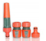przyłącze na kran 1", łącznik węża 3/4", dwie szybkozłączki do węża 3/4" (w tym jedną z funkcją AQUA STOP) oraz końcówkę zraszającą.