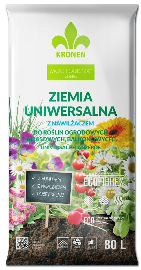 Ziemia uniwersalna KRONEN z nawilżaczem i nawozem jest przeznaczona do sadzenia i przesadzania wielu gatunków roślin zielonych i kwitnących, warzyw, ziół, bylin, iglaków w domach na balkonach, tarasach i w ogrodach, z wyjątkiem roślin kwaśnolubnych. Ziemia uniwersalna to wysokowartościowe, naturalne podłoże wyprodukowane na bazie torfu wysokiego o różnym stopniu rozkładu w oparciu o recepturę i doświadczenie profesjonalnych ogrodników. Ziemia uniwersalna zawiera nawilżacz i nawóz wieloskładnikowy z mikroelementami.