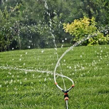 Zraszacz wbijany w ziemię, obrotowy z dwoma końcówkami zraszającymi (kąt zraszania 360°, zasięg 14m, wydajność 14l/min-3 Bar). Wykonany z tworzywa sztucznego. Jego zaletą jest cicha praca i strumień wody typu fontanna.